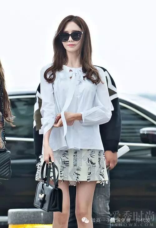 林允儿穿白色淑女上衣配个性剪裁的短裙,甜美清新,气质乖巧清纯。‘