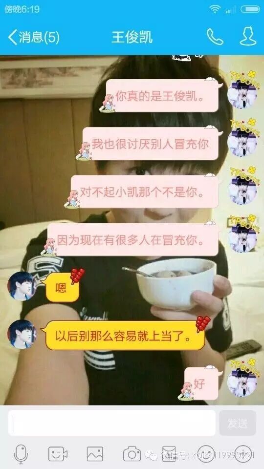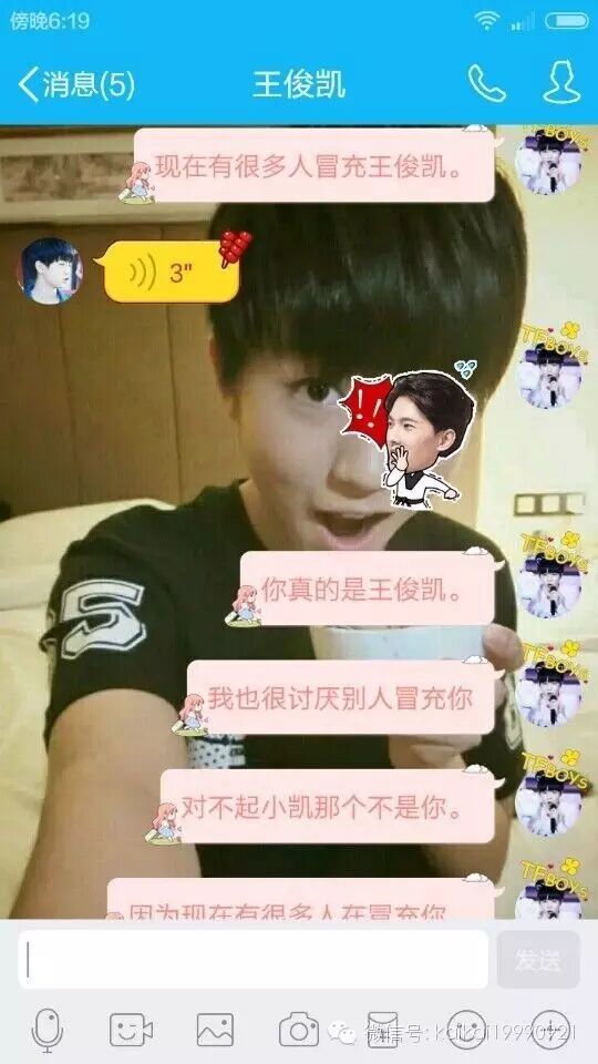 【通知】王俊凯本人没有任何公开的账号 请勿上当受骗 TF小凯 内地男星 2016-03-24 11:04:41 626 创作不易,用心坚持,欢迎请BaGua喝几杯爱心咖啡!打赏并支持本文 打赏并删除本文 戳上面的蓝字关注TF小凯哦!TFBOYS微信号:kaikai19990921【小螃蟹们】 这里是关小凯最新动态发布及每日发送小凯精美图文消息.【分享须知】 小螃蟹们多多分享支持你心目中的王俊凯. 近日在某些社交场合发现以下聊天记录,再次说明:王俊凯没有任何公开账号,如有公开账号都是个人所为,请大家不要上当受骗,也请粉丝朋友不要自编自演,也请大家提高警惕.说明:以上都是虚假的. 创作不易,用心坚持,欢迎请BaGua喝几杯爱心咖啡!打赏并支持本文 打赏并删除本文 感谢您的支持鼓励,我会继续努力的!文章地址:用户邮箱:打赏金额:USDT 请输入数字点击”去打赏“,即可进行打赏支持本文章哦 王俊凯 About the Author TF小凯 功能介绍:家族说明:为防止小螃蟹上当受骗,本账号不属于个人账号,王俊凯也没有任何公开账号,如有公开账号散播纯属网友私人所为,不要上当受骗,本账号只提供王俊凯娱乐及活动行程的相关新闻消息! Related Posts TFBOYS三周年粉丝见面会门票大抽奖 2016-07-01 13:56:54 王俊凯表情包来袭 2016-06-24 13:26:56 王俊凯食堂吃饭照片曝光 2016-06-24 13:26:56 TFBOYS观察日记《观时尚》杂志独家专访【视频】 2016-06-22 13:31:42 父亲节——王俊凯描绘自己心中的爸爸 2016-06-19 13:33:55 发表评论