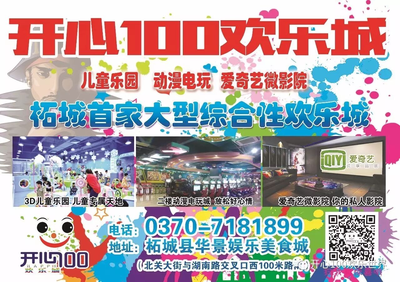 开心100欢乐城地址:柘城县华景美食城(北关大街与湖南路交叉口向西100米路南榕湖花园酒店西侧)电话:0370——7181899
