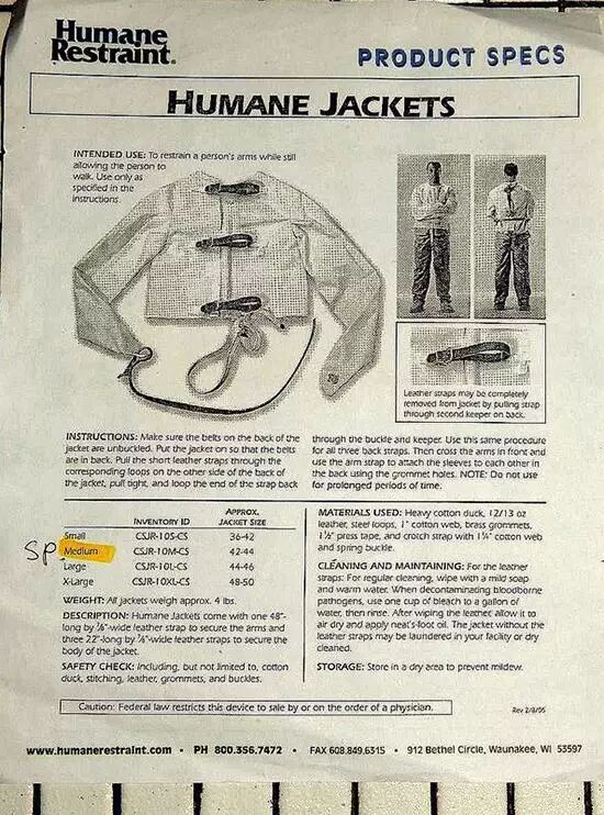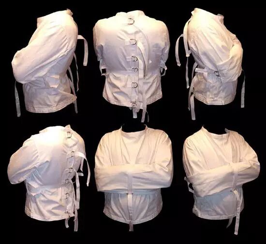 虽然原来在电影里看过有警察和医护人员给罪犯或者精神病人穿上这种外衣,但我始终纳闷为什么这些人的表情会呈现出那么夸张的惊恐感——直到试穿十来分钟后,我的胳膊、肩膀开始出现酸痛,甚至感觉呼吸都很困难,并且伴随着一股旧衣服散发出的发霉味道弥漫在鼻腔时,那种因上肢无法活动而带来的恐惧焦灼感让我有一种可云附身,戏瘾大发的喊叫冲动:“谁来救我!?”。