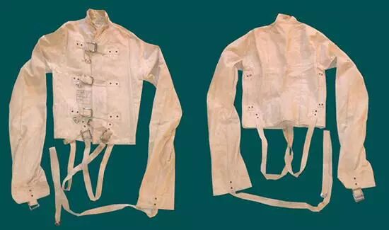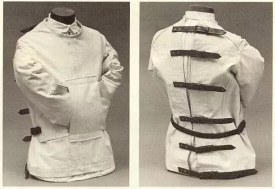 初期的Straitjacket非常简陋,通常都是在普通的病号服上改良而成,这些棉麻布制成的衣服除了在袖子上呈现与众不同的样式外,“讲究”一些的则会在前胸附上类似裤耳式的袢头,以便打结袖子时能够外加一层防锁,但即便是这样,Straitjacket仍不是王母娘娘手里的天罗地网。