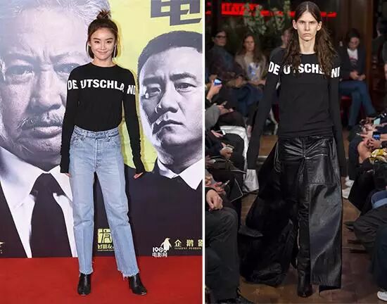 这不,袁姗姗也是超长袖的忠实粉,几天前她身穿Vetements黑色超长袖字母卫衣搭配淡蓝色工装牛仔裤亮相《我的特工爷爷》清华大学首映礼,简单服饰梳半丸子头,清爽又不失俏皮!特别值得一提的是,袁姗姗是国内首个在公开活动上穿Vetements的女星,品牌冲破局限、自由不受拘束的年轻化理念与她的气质和态度不谋而合!