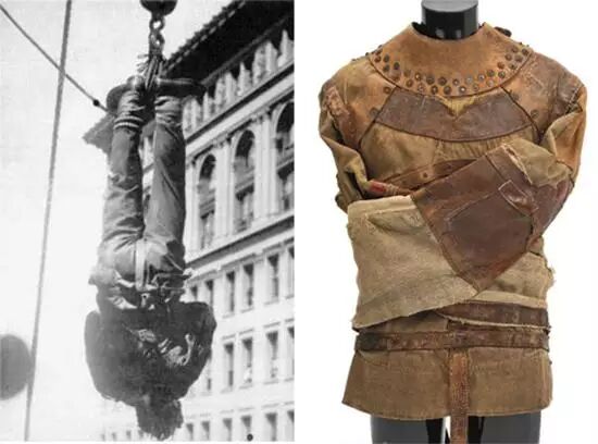 正在表演户外倒挂脱逃术的Harry Houdini和演出时穿过的Straitjacket