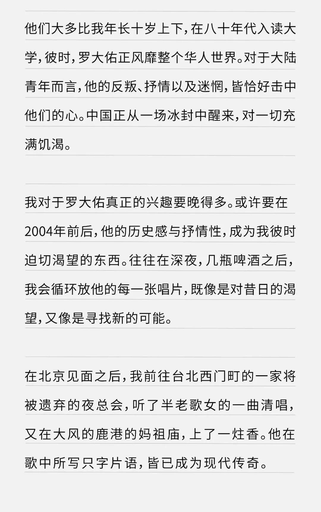 罗大佑:我觉得这样挺好的,干一行就要像一行。如果一个搞创作的人,可以到死前才刚刚发表唱片,好像预言着某些事情,我觉得这样很好。士兵不就是应该死在前线吗?
