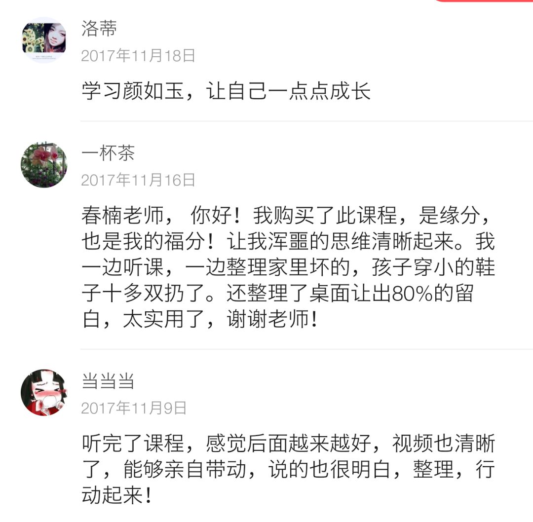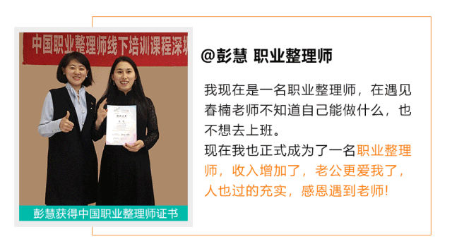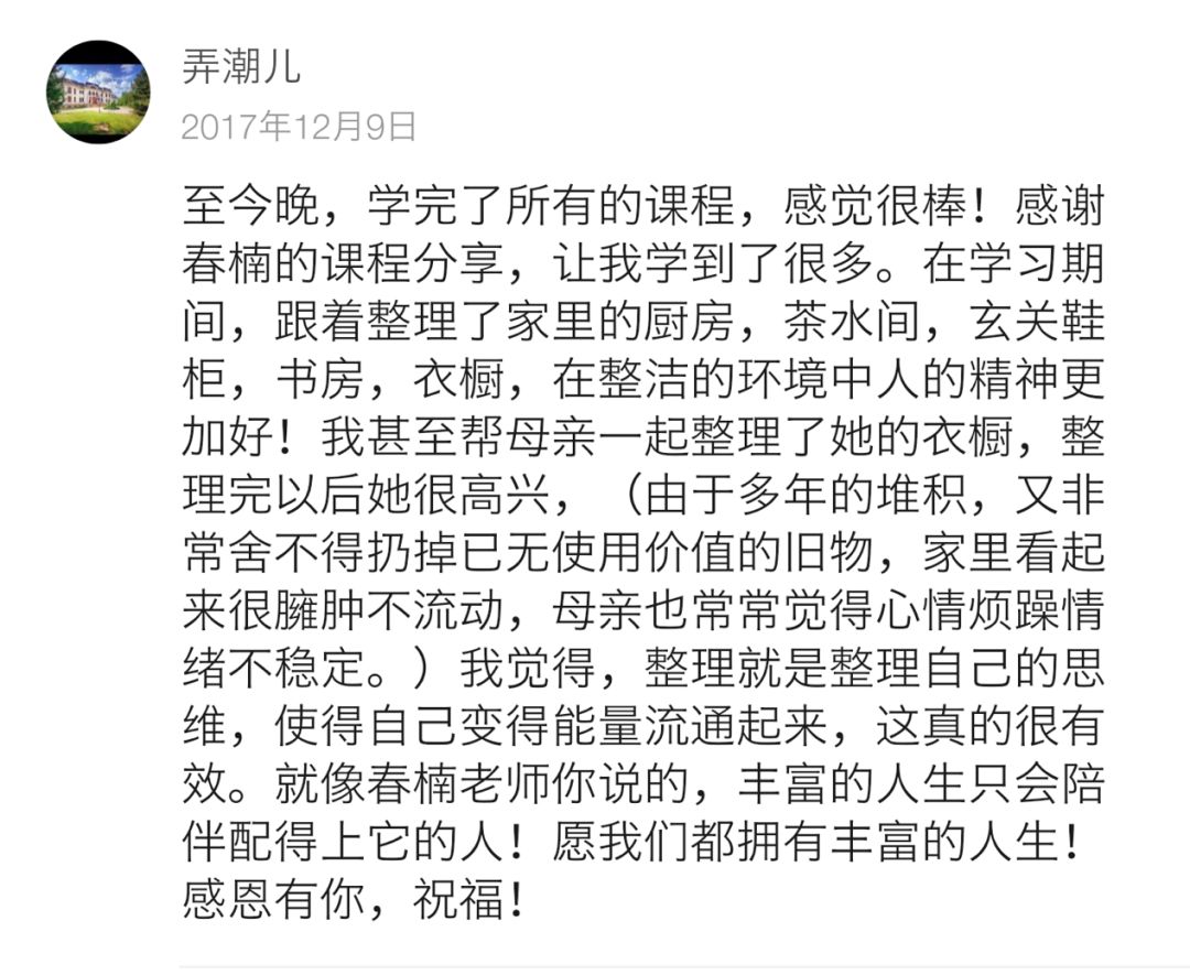 推荐语:我和春楠因为整理而相识,我们的家井井有条,家庭和周边的关系也因为整理变得越来越融洽。我作为她身边最亲近的人,一直被她对整理的热情和对学员的用心所感动,强烈推荐!