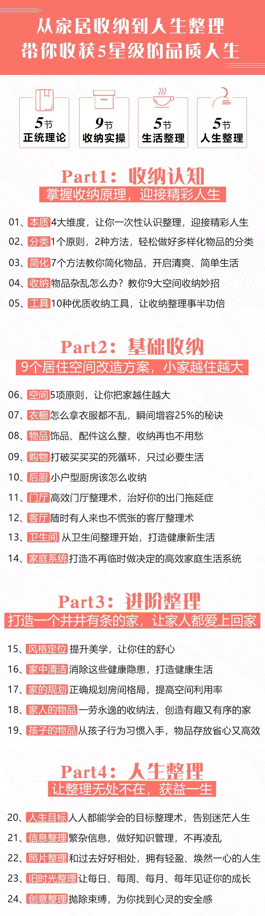 今天,春楠老师在这里,将她的收纳整理术归纳成24节精品课程,从理论到实操,从生活整理到人生整理,实实在在地带你收获5星级的品质人生。