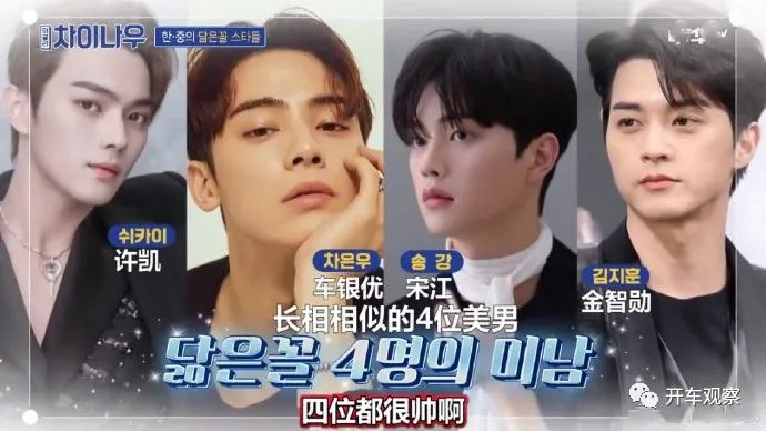 该节目主持人们后面还称许凯与车银优、宋江两位韩国年轻男星神似,说实话这就有一点扯了,许凯与车银优并不是很像,无论是脸蛋还是身材各方面,都相差蛮大的,虽然两人都是帅哥,但脸型就不一样,所以并不是很相似;许凯与宋江确实有点像,他们的脸型很相似,而且皮肤都是白皙类型的,如果都留着同样的发型,那看起来可能会更像。