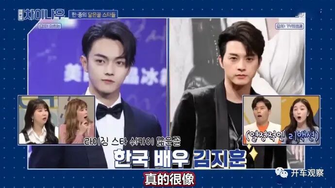 这档韩国节目的主持人们认为许凯与金智勋长得很像,连深邃的双眼皮也一模一样,据悉金智勋是韩国知名男演员,他也算是韩国花美男的代表性人物了,其主演的《媳妇的全盛时代》、《来了!张宝利》都是大热的韩剧,最近两年,金智勋留了长发,所以看起来可能与许凯不是很像,但他之前短发的时候,与许凯确实是有点像,特别是脸型很像,只不过许凯长得比较白皙秀气一点,而金智勋则显得更加粗犷一些。