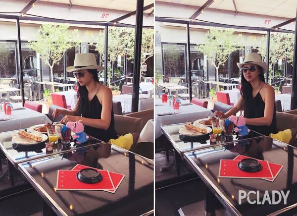 有了好的肌肤状态,除了拍摄工作,在这个极适合度假的小镇自然要四处寻觅一番的。走进一家餐厅,点上一份法式餐点,连同小猪佩奇也品尝到了当地美味。