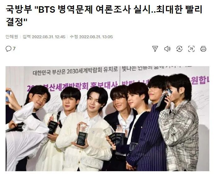 韩国防部“实施防弹少年团兵役问题舆论调查,会尽快做出决定”