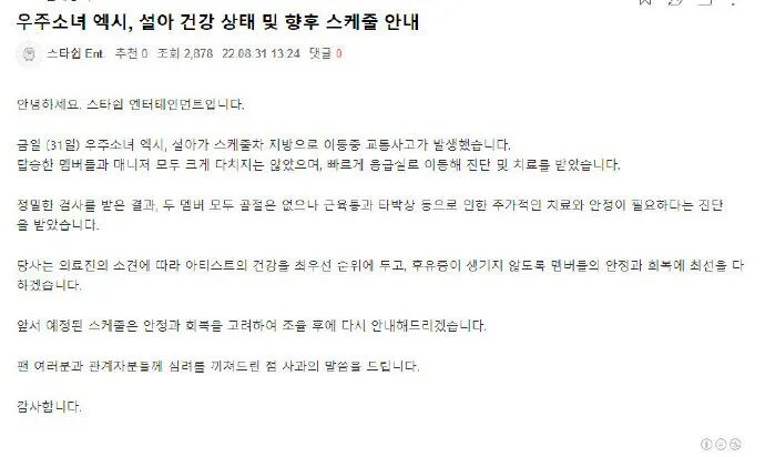 两位成员经过精密检查都没有骨折,但因肌肉痛和挫伤等需要追加治疗和安定。我司将根据医疗团队的意见,把艺人的健康放在首位,尽全力稳定和恢复成员们的健康,以免留下后遗症。