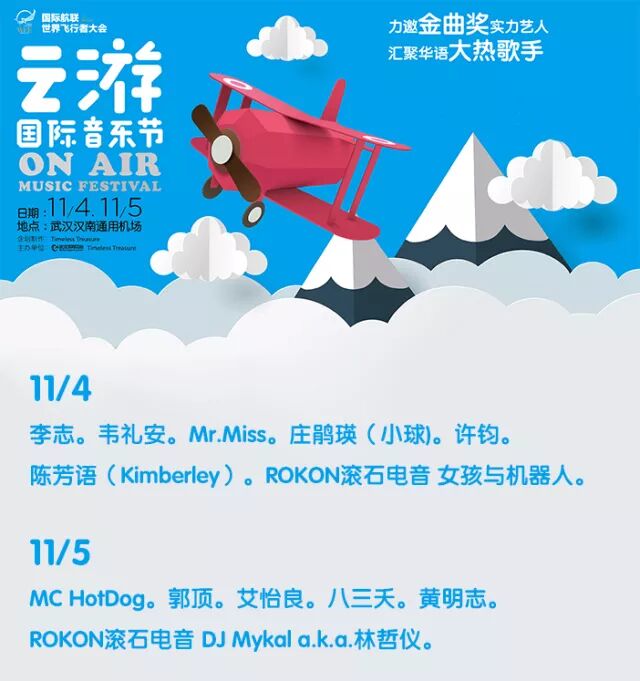 作为国际航联世界飞行者大会与“On Air云游国际音乐节”的首次跨界合作,无论是在歌手的选择,还是在舞台的设计上,主办方都希望观众可以真的在现场体会到“云游四方”的自由,用音乐为观众带去最愉悦的假日体验。观众只要购买一张门票,即可同时参与飞行者大会与音乐节,可谓最超值的音乐节。最好玩的音乐现场,最愉悦的假日体验,尽在On Air云游国际音乐节!