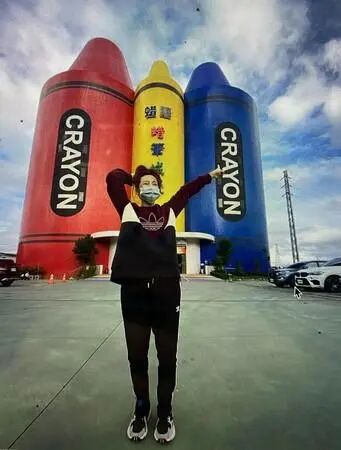 五张照片中有三张是陈宝站在蜡笔工厂前拍照、绘画、踏青照,都是独照,另2张是则是谢和弦自己发在社交平台上的照片。