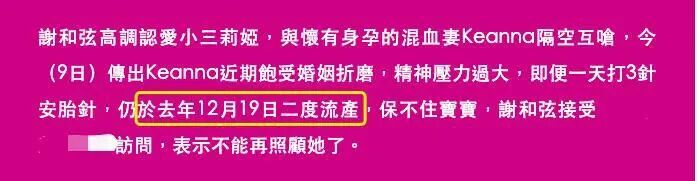 期间,正妻Keanna曾在社交平台上发布了一张腹中胎儿的B超照片,仍无法挽回谢和弦,还不断遭到他炮轰,嘲讽她“不会生孩子。谢和弦那时还隔空喊话,表示一定会和老婆离婚。