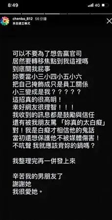 对于之前陈宝在网上痛批莉娅,可以不要为了想告赢官司,居然要转移焦点到我这里吗?到底关我屁事!你要当小三小四小五小六,把自己掩饰成只是员工关系,小三变成是我?这招真的很高明等言论,莉娅表示将会保留法律追诉权。