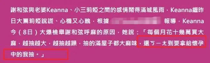 1月初,Keanna“手撕小三莉娅是一个“心机女,还自曝谢和弦每个月要花十几万台币买毒品,还把毒品拿给怀孕中的她抽,遭网友痛骂“丧心病狂。