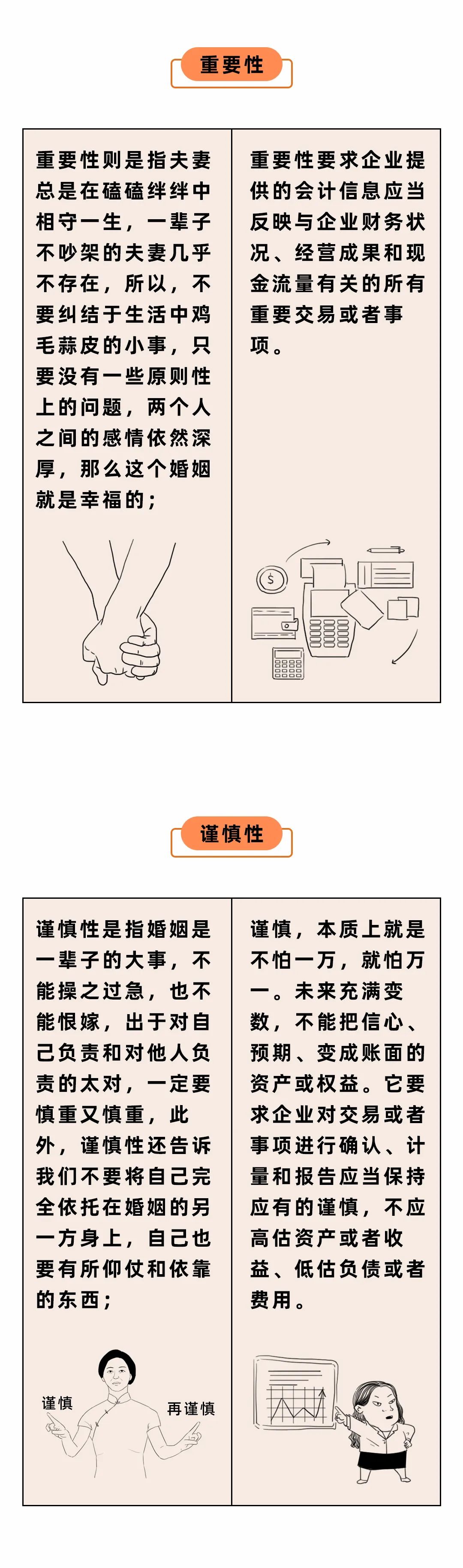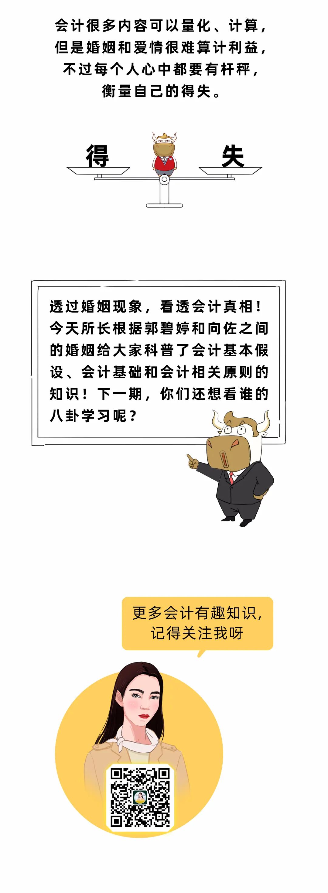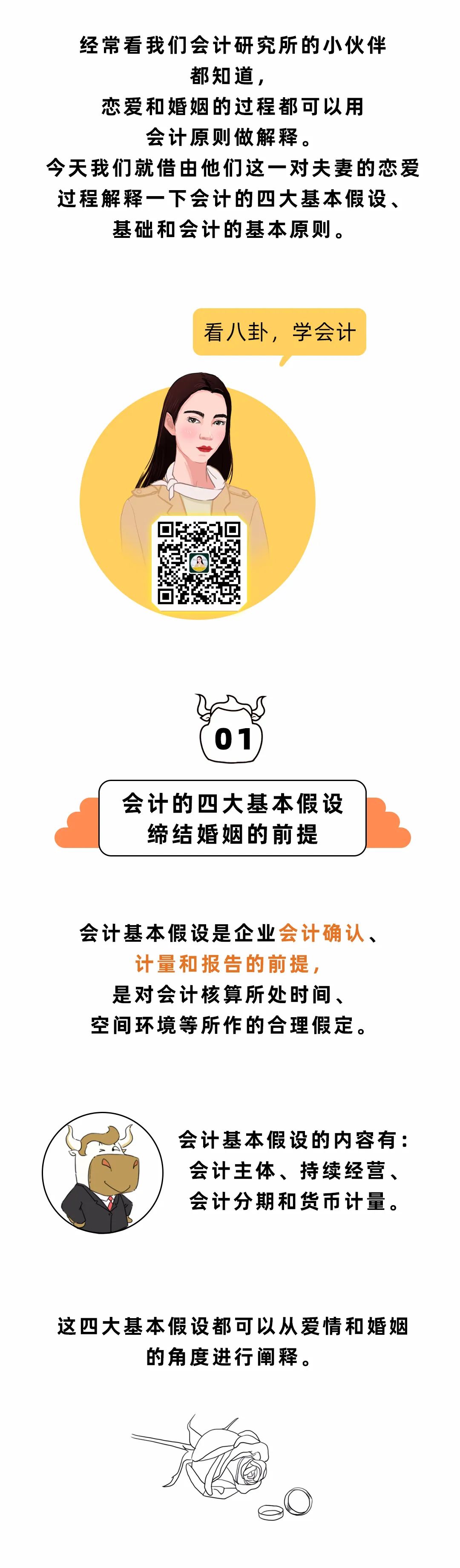 郭碧婷被骗婚?好的婚姻,必须会“算计”! 注册会计师 港台女星 2020-03-16 14:55:10 820 创作不易,用心坚持,欢迎请BaGua喝几杯爱心咖啡!打赏并支持本文 打赏并删除本文 世事洞明皆学问,人情练达即文章。财会这门学科包罗万象,可以用来解释很多东西!不被看好的综艺情侣,再到令人艳羡的豪门神仙眷侣,郭碧婷和向佐这一对一直备受关注,最近,令人惊讶的是,举办了轰轰烈烈婚礼的他们,竟然还没有领证?令人惊讶的同时,也让我们不得不思考,婚姻的本质是什么呢?如果从会计的角度来看待这一系列的问题,他们身上到底有什么道理可说呢?如果大家留心的话,今天我们分享的内容都是会计最基础的知识,会计的基本假设、会计基础和会计信息质量要求,这是每一个会计专业学子接触会计必须要了解的知识,这是接下来所有行为的基础。同样地,对于婚姻也是如此,两个人从不熟悉到相识、相恋、走向婚姻殿堂,再到白头偕老,这一系列过程也需要基础和铺垫,爱情、信任、坦诚、诚意等等都是婚姻过程的基石。有人说,我们的婚姻不应该总是这样“算计”,但是在我看来,得不到回应的感情是不能长久的,我有付出,你也有回报,两个人珍惜彼此,这样的爱情才能永葆年轻!希望你也能找到满足会计这八大原则的人!策划:高顿新媒体内容中心文案:尼莫设计:Lina审核:Tony▎本文由注册会计师转载自会计研究所,编辑注会菌。由高顿新媒体中心出品,文案:尼莫;设计:Lina;审核:Tony。如需转载,请务必联系授权,侵权必究。 创作不易,用心坚持,欢迎请BaGua喝几杯爱心咖啡!打赏并支持本文 打赏并删除本文 感谢您的支持鼓励,我会继续努力的!文章地址:用户邮箱:打赏金额:USDT 请输入数字点击”去打赏“,即可进行打赏支持本文章哦 郭碧婷 About the Author 注册会计师 功能介绍:专业的注册会计师学习平台与职业发展平台,助力于每一位CPA人的价值取得!关注我们,与百万注会考生共同学习、交流、进步! Related Posts 张艺兴去清华读金融了 2021-05-26 13:31:24 郭碧婷被骗婚?好的婚姻,必须会“算计”! 2020-03-16 14:55:10 张雨绮复合的会计分录! 2018-11-27 12:47:32 霍思燕,你到底在哪找的男人? 2018-05-15 13:54:06 林志玲胖到被迫道歉:你的不自律,正在“毁”掉你 2018-03-10 15:22:28 发表评论