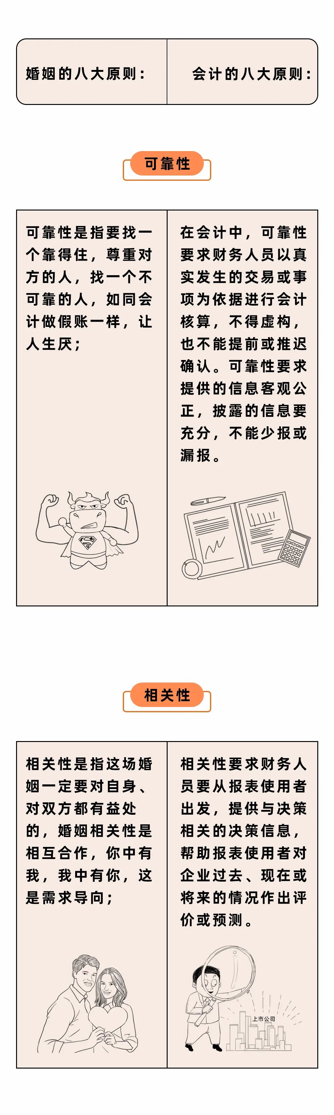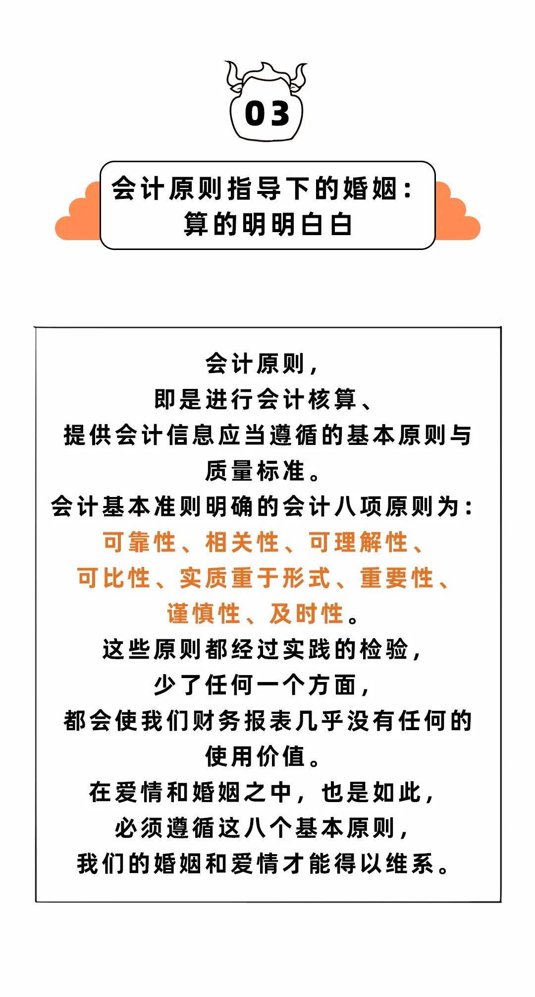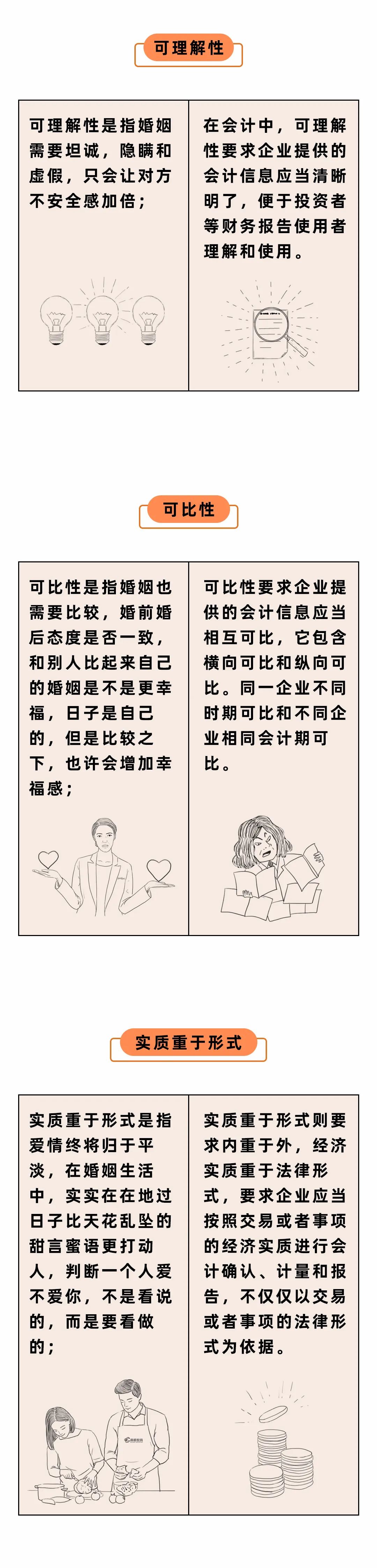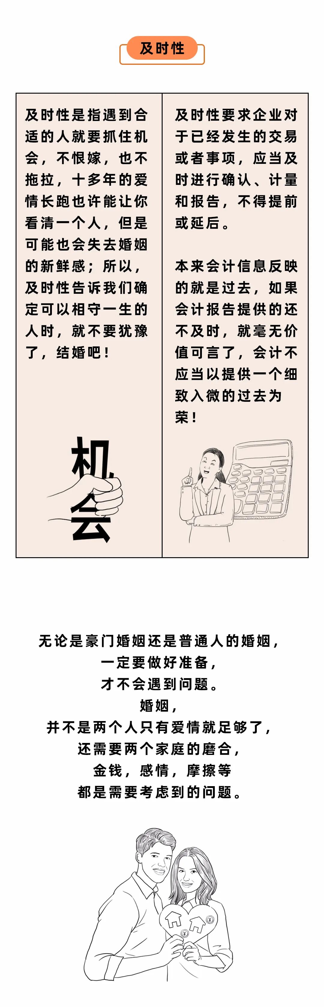 郭碧婷被骗婚?好的婚姻,必须会“算计”! 注册会计师 港台女星 2020-03-16 14:55:10 820 创作不易,用心坚持,欢迎请BaGua喝几杯爱心咖啡!打赏并支持本文 打赏并删除本文 世事洞明皆学问,人情练达即文章。财会这门学科包罗万象,可以用来解释很多东西!不被看好的综艺情侣,再到令人艳羡的豪门神仙眷侣,郭碧婷和向佐这一对一直备受关注,最近,令人惊讶的是,举办了轰轰烈烈婚礼的他们,竟然还没有领证?令人惊讶的同时,也让我们不得不思考,婚姻的本质是什么呢?如果从会计的角度来看待这一系列的问题,他们身上到底有什么道理可说呢?如果大家留心的话,今天我们分享的内容都是会计最基础的知识,会计的基本假设、会计基础和会计信息质量要求,这是每一个会计专业学子接触会计必须要了解的知识,这是接下来所有行为的基础。同样地,对于婚姻也是如此,两个人从不熟悉到相识、相恋、走向婚姻殿堂,再到白头偕老,这一系列过程也需要基础和铺垫,爱情、信任、坦诚、诚意等等都是婚姻过程的基石。有人说,我们的婚姻不应该总是这样“算计”,但是在我看来,得不到回应的感情是不能长久的,我有付出,你也有回报,两个人珍惜彼此,这样的爱情才能永葆年轻!希望你也能找到满足会计这八大原则的人!策划:高顿新媒体内容中心文案:尼莫设计:Lina审核:Tony▎本文由注册会计师转载自会计研究所,编辑注会菌。由高顿新媒体中心出品,文案:尼莫;设计:Lina;审核:Tony。如需转载,请务必联系授权,侵权必究。 创作不易,用心坚持,欢迎请BaGua喝几杯爱心咖啡!打赏并支持本文 打赏并删除本文 感谢您的支持鼓励,我会继续努力的!文章地址:用户邮箱:打赏金额:USDT 请输入数字点击”去打赏“,即可进行打赏支持本文章哦 郭碧婷 About the Author 注册会计师 功能介绍:专业的注册会计师学习平台与职业发展平台,助力于每一位CPA人的价值取得!关注我们,与百万注会考生共同学习、交流、进步! Related Posts 张艺兴去清华读金融了 2021-05-26 13:31:24 郭碧婷被骗婚?好的婚姻,必须会“算计”! 2020-03-16 14:55:10 张雨绮复合的会计分录! 2018-11-27 12:47:32 霍思燕,你到底在哪找的男人? 2018-05-15 13:54:06 林志玲胖到被迫道歉:你的不自律,正在“毁”掉你 2018-03-10 15:22:28 发表评论