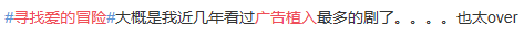 还有许多网友吐槽“看个剧像逛商场”,称此剧为广告代言剧,不少网友也良心建议:整部剧可以改名叫做《寻找广告的冒险》——