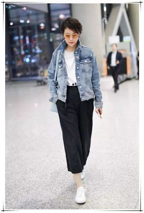 海清的机场私服,一件蓝色牛仔外套搭配黑色宽松八分裤 搭配一双小白鞋,简直嫩到炸裂,无敌了。