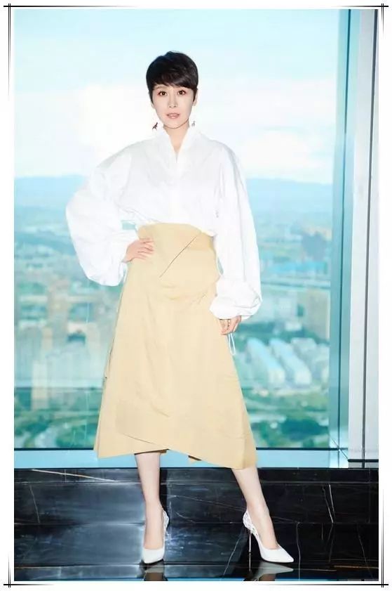 海清这次身穿一件白色衬衫搭配黄色的半身裙,脚上一双白色高跟鞋,非常的优雅大方。