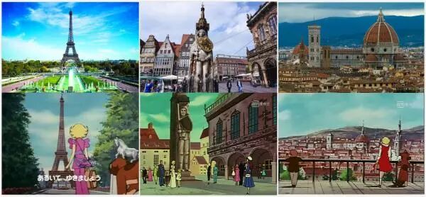 本剧以周游列国的方式展开和推进剧情,像是一部地理教科书。一集一地,一事一景,无论是节奏控制还是内容设置都较为容易。小蓓的寻花足迹涉及西欧、北欧和北非。她从法国出发,途径西班牙、荷兰、前西德、瑞士、瑞典、挪威、英国、摩洛哥、突尼斯、埃及、意大利,再回到法国。一路上,风景如画的异国风光和引人入胜的异国风情成功地吸引了少年儿童观众。东映为了这部动画可说是煞费苦心。为了获得实景素材,本片导演伊藤英治走访了相关国家的驻日使馆和文化代表处,索取旅游书籍与影视资料,尽可能用实地将所涉国家的自然风光、人文古迹收入动画之中。因此,我们通过动画见识到了法国的埃菲尔铁塔、西德不来梅市政厅广场、意大利佛罗伦斯教堂及威尼斯水城等知名景点。