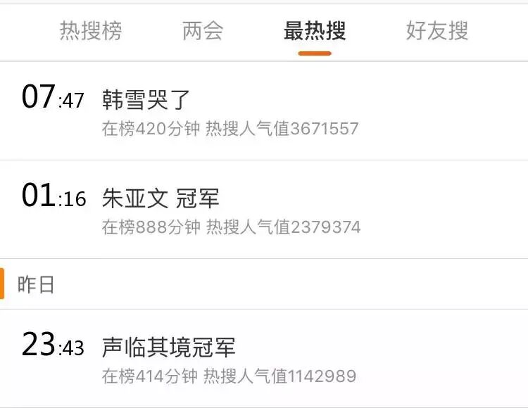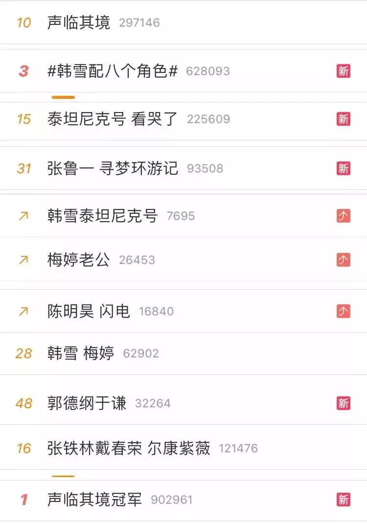 这档口碑节目的完结篇创造的三连击包括“声临其境冠军”、“朱亚文 冠军”和“韩雪哭了”,其中18日凌晨1点16分登顶的“朱亚文 冠军”在榜时间最长,达779分钟,搜索量超过343万;23:43分节目尚未播完时“声临其境冠军”的词条抢先出炉,在榜时间则达到414分钟;而到18日上午7:47分,与节目内容相关的“韩雪哭了”轮换成为榜首。