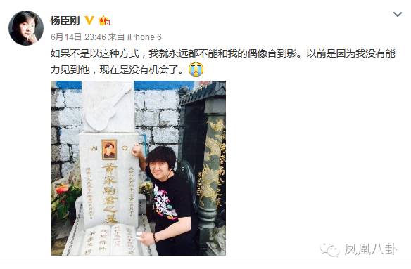面对网络热议,6月14日,杨臣刚再发微博解释,又明晃晃地晒出一张与黄家驹墓碑的高清合影。文字称: