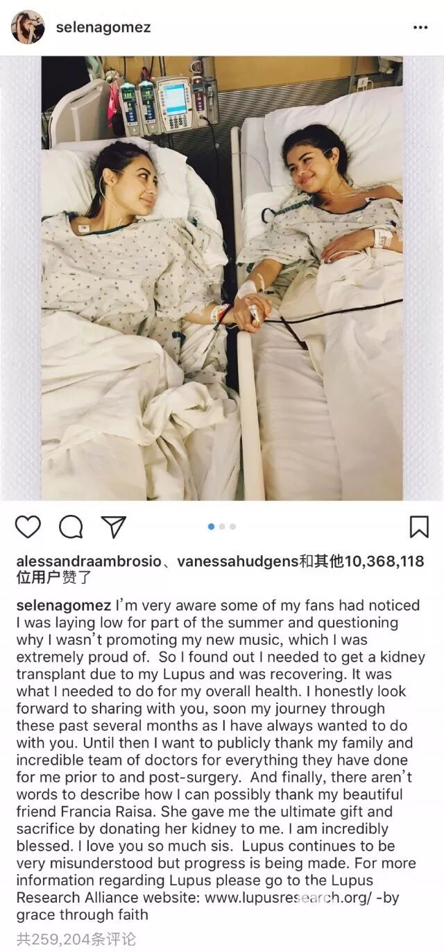 因为红斑狼疮复发,傻脸娜不得不进行肾脏移植手术。手术做完后,Selana在ins上发布长文感激家人和医生。