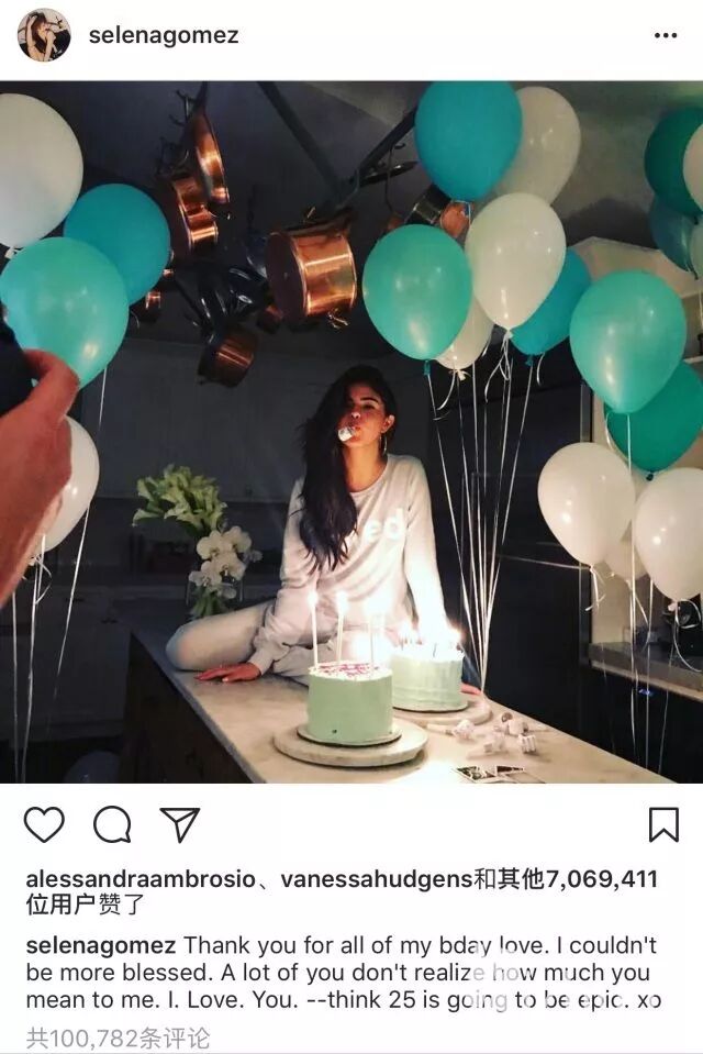 这张照片是傻脸娜今年25岁生日时候发的,感谢了大家对她的生日祝福,并表达了对粉丝的爱。AA还有Vanessa Hudgens都给点了赞,这张照片同时还获得了10万+的评论,放在微博也是顶级流量的待遇啊!