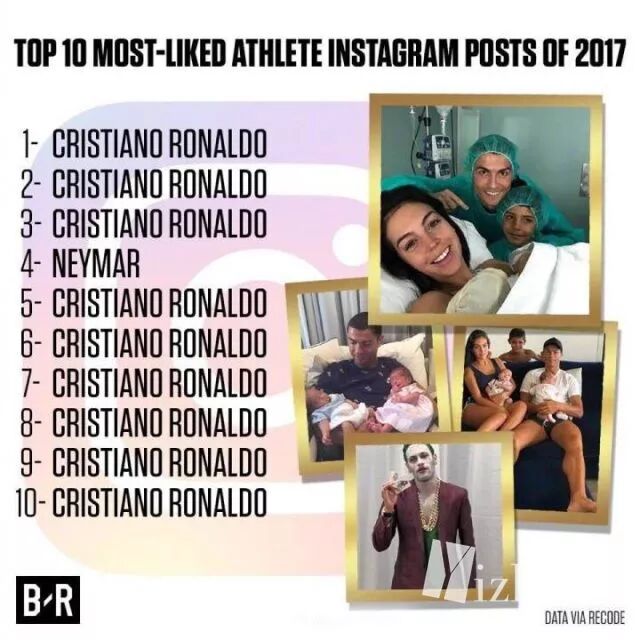 而再2017年运动员获赞数最多的排行榜上,前十名,C罗一个人占了九名。刚才我们不是说去年的名单傻脸娜占了八名吗?剩下两个名额就是C罗的。