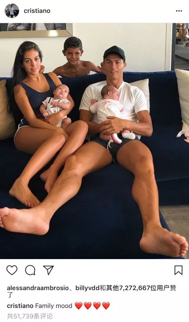 在刚才那张一家六口照片之前,C罗在ins上分享了他抱着自己刚出生不久的龙凤胎小朋友照片,并配文:“非常开心能够抱着我生命中的两位新挚爱。”这张温馨的照片总共获得了825万次赞。