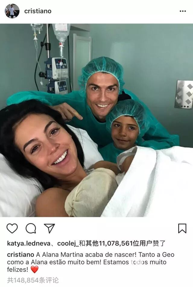 刚刚过去的11月,C罗和女友乔治娜迎来了一位小公主,这也是C罗的第四个孩子。C罗和大儿子迷你罗穿着无菌服站在病床旁,乔治娜抱着小女儿,这温馨的一幕最后获赞1107万~