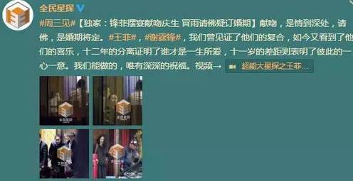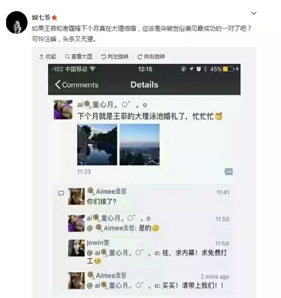 就在2015年年末时,网络上还在盛传的“锋菲即将大婚”,微博流传一张疑似婚庆公司工作人员的爆料,在这张来自私人朋友圈的截图里,这位网友爆料称锋菲即将于下月大理完婚,并附上婚礼地点的优美风景。