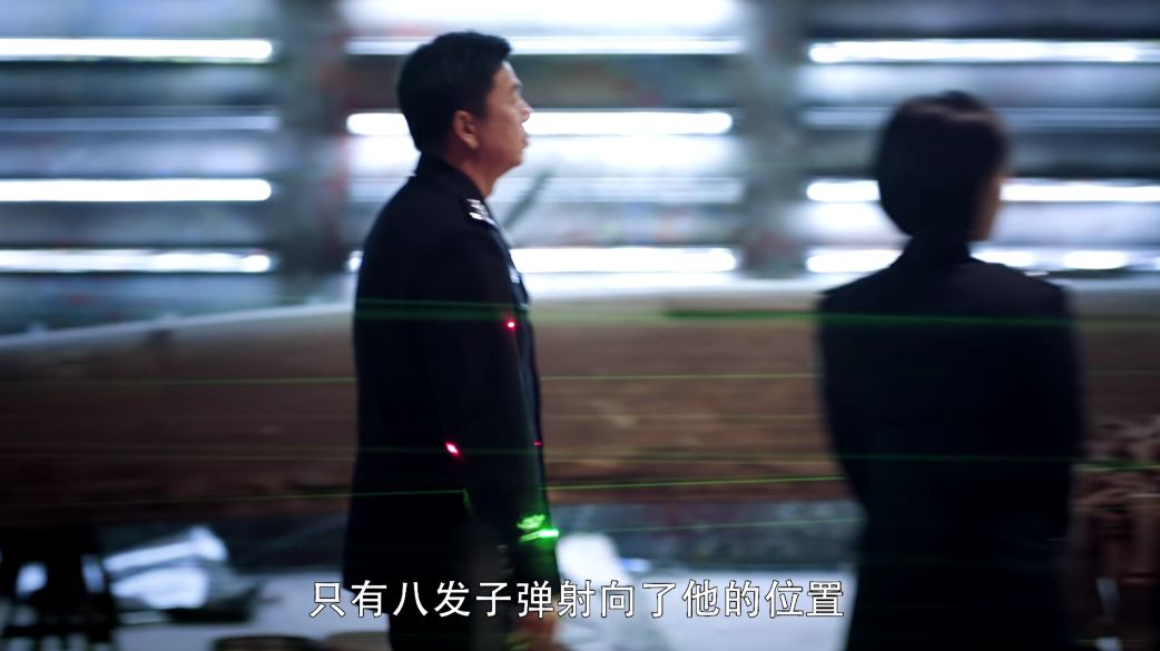 还原的枪击现场,红绿光柱标记出弹道轨迹,恰好站在色谱的两端。