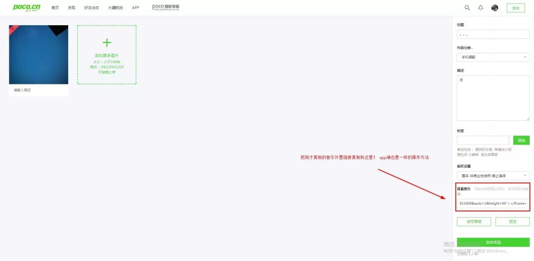 在上传作品的页面中找到“背景音乐”的选项,将刚才复制好的代码粘贴到这里来: