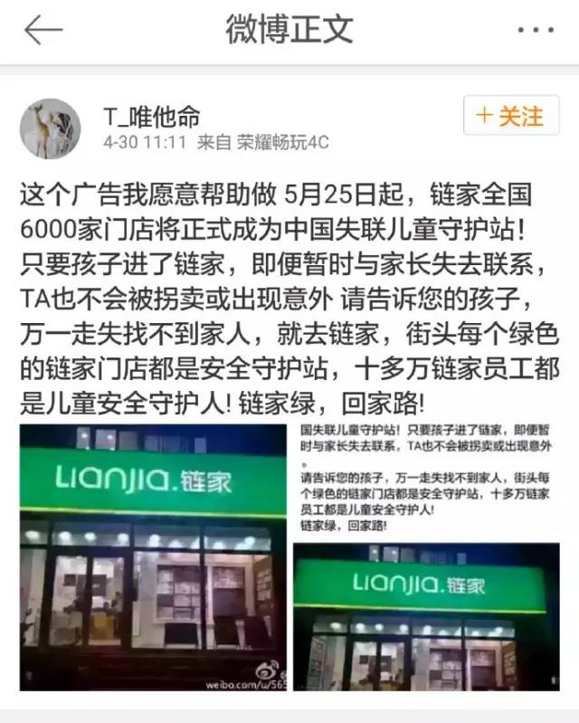 最近,不少朋友圈被一场“爱心接力”刷屏了,文中称从5月25日起,链家全国6000家门店将正式成为中国失联儿童的守护站。