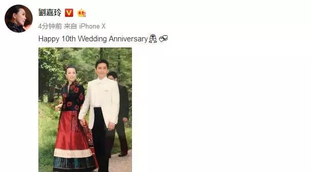 刘嘉玲和梁朝伟结婚多年,虽没有孩子,但夫妻感情一直很好。今天是梁朝伟和刘嘉玲结婚10周年纪念日,刘嘉玲在微博中晒出了两人结婚时的照片。
