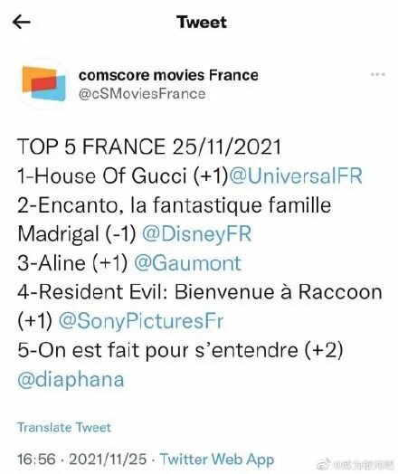 《HOUSE OF GUCCI》上映首日票房达到421万美元,成为法国本周仅次《奇幻魔法屋》第二卖座的电影。