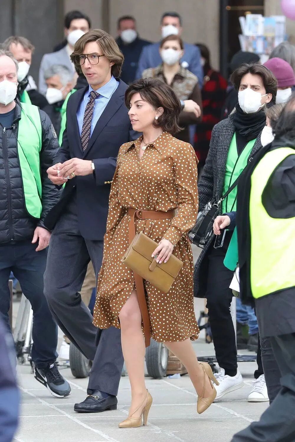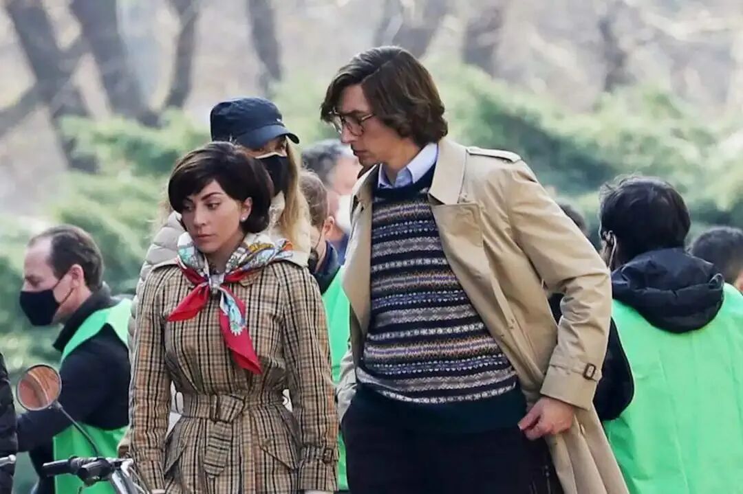 当时的男士审美崇尚于英国绅士,可以看到 Gaga 身旁的 Adam Driver 一身干净利落的西装,脚踩马衔扣乐福鞋。