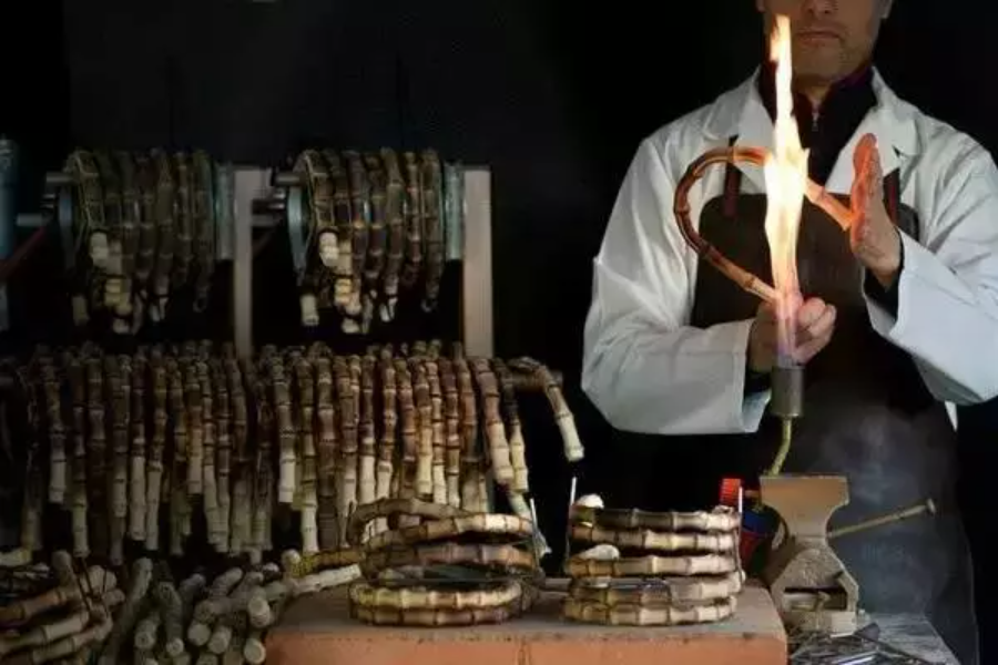提手的材料采用日本进口竹藤,需工匠花13个小时纯手工制造完成,再结合加热以及弯曲的工艺制成竹节包。