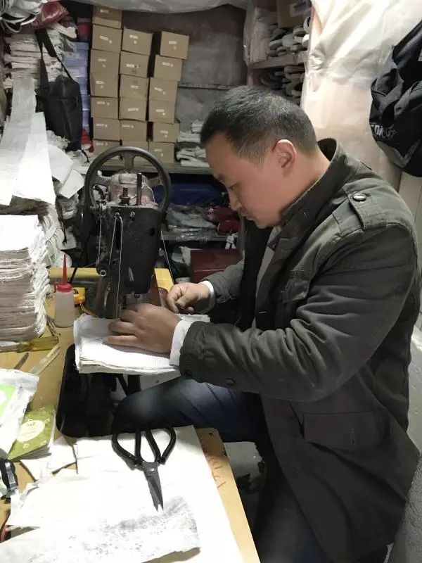 △店里沈飞师傅的儿子正在缝制鞋帮