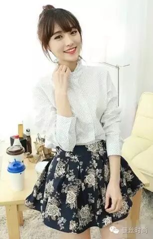 白色波点衬衫十足的小清新风,花边立领增添复古而柔美的气息,显得俏皮可爱,搭配藏蓝色印花短裙,蓬蓬裙裙摆轻盈灵动,正好遮挡住粗大腿,超短裙的设计更显腿长。