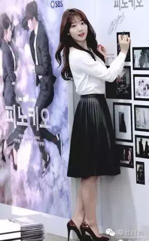 朴信惠身穿简约的白色衬衫,优雅而知性,搭配黑色皮裙,时尚显瘦,脚踩酒红色高跟鞋,显得高挑迷人,这样穿完全看不出来她的腿粗了。