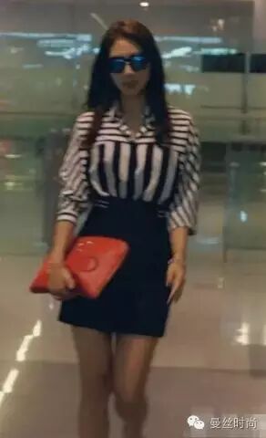 这款条纹衬衫采用横条纹和竖条纹结合的设计,时尚而知性,既显气质又显瘦,搭配经典百搭的黑色短裙,遮挡住粗壮的大腿,显瘦效果很赞。
