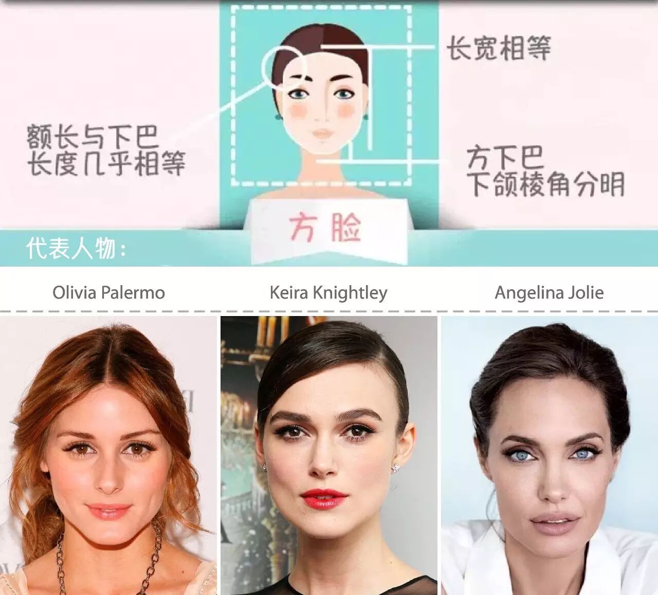 方脸应该属于比较好辨认的脸型,除了方下巴外,明显的下颌角很容易给人留下深刻印象,比如有“纽约第一名媛”之称的Olivia Palermo。