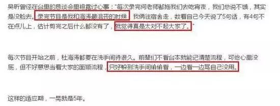 海涛和吴昕的感情确实很深厚,毕竟两人算是患难与共的战友。当年一起进入《快乐大本营》,一起经历在台上手足无措的时候。每次节目开始之前,杜海涛都会躲在洗手间偷偷看台本,一边看一边骂自己没用。吴昕也曾说过,刚开始那几年,每次录完节目何老师都会拖她和海涛去宵夜,但他们总说不饿,其实是没脸去,因为整期节目就只说过四五句话,剪完之后就什么都没有了。