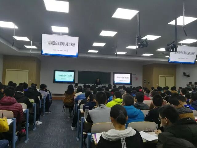 离讲座正式开始还有二十分钟,教室里已经座无虚席,同学们已经拿出课本自主复习,等候黄老师的到来。讲座开始后,黄玲老师首先带领同学们复习了工程制图部分知识点,对于一些易错、应注意的知识做了特别提醒,并在黑板上画图说明,助于理解记忆。黄玲老师清晰的思路,全面的思考方式,严谨的作图习惯给在座的每一位同学留下了深刻的印象。