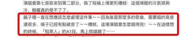 他在微博上说:「每当自己嗓子快要破音了,就要向下走下三度音,后面有和声老师掩护,前面有观众主唱着。」