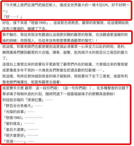 当晚,歌迷们群情高涨,一首接一首的大合唱,仿佛青春的气息回荡在澳门上空。